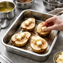 Pieczenie gruszek: przełóż gruszki do naczynia żaroodpornego skórką do góry, dodaj kawałki 30 g masła rozmieszczone między kawałkami. Piecz w 180°C przez 20-30 minut, aż gruszki będą miękkie przy nakłuciu (drewniany patyczek wbity w miąższ powinien wchodzić łatwo, ale nie rozpadać owocu). Po upieczeniu skrop opcjonalnym rumem i odstaw do lekkiego przestudzenia.