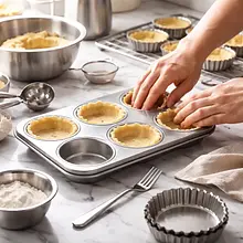 Podpiecz bazy: umieść foremki na blaszce i podpiecz spody 12-15 minut w 190°C aż brzegi będą lekko złote, a spód suchy i przełamywalny. Jeśli masz obciążenia do pieczenia (ceramiczne kulki lub suche groch), możesz je użyć na czas podpiekania by zapobiec wybrzuszaniu się dna.