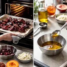 Wyjmij buraki z piekarnika. W małej miseczce wymieszaj 30 g miodu z 10 g oliwy i 15 g świeżo wyciśniętego soku z cytryny. Polej mieszanką gorące buraki i delikatnie nimi zamieszaj (użyj dwóch łyżek), by glazura pokryła kawałki. Odstaw na 5 minut — miód lekko się skarmelizuje i stworzy błyszczącą powłokę.