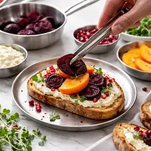 Ułóż tartinki na dużej drewnianej desce lub półmisku. Upewnij się, że kolory są równomiernie rozłożone — ciemnoczerwone buraki, pomarańczowe plastry persymony i rubinowe pestki granatu powinny tworzyć atrakcyjny wzór. Podawaj natychmiast, aby pieczywo pozostało chrupiące.