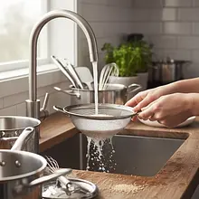 W czasie gdy warzywa się pieką, ugotuj komosę. Wsyp komosę na drobne sitko i bardzo dokładnie przepłucz pod zimną, bieżącą wodą, mieszając ją palcami przez około minutę. Ten krok jest kluczowy, by pozbyć się saponin – naturalnej, gorzkiej otoczki ziaren.