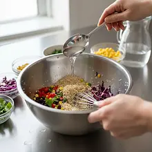 Teraz zacznij stopniowo, łyżka po łyżce, dodawać zimną wodę, cały czas energicznie mieszając. Zobaczysz, jak gęsta pasta magicznie zamienia się w gładki, kremowy i lejący się sos. Dodawaj wodę aż do uzyskania pożądanej konsystencji – powinna być podobna do rzadkiego jogurtu lub śmietany. Na koniec dopraw szczyptą soli i spróbuj. W razie potrzeby dodaj więcej soku z cytryny (jeśli lubisz kwaśniej) lub syropu klonowego (dla słodyczy).