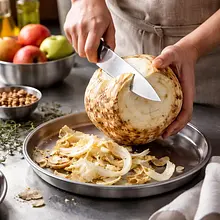 Podawaj od razu po przygotowaniu, na szerokich talerzach. Można serwować z cienkimi kromkami ciemnego chleba lub jako dodatek do pieczonego mięsa. Jeśli używasz sera pleśniowego, dodaj go tuż przed podaniem, by nie rozpuścił się w cieple selera.