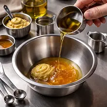 W średniej miseczce połącz resztę 45 g oliwy z oliwek, 20 g musztardy Dijon, 30 g miodu i 30 g octu jabłkowego (jeśli użyłeś 10 g wcześniej do jabłek, użyj teraz pozostałych 30 g z całości 40 g). Dodaj 1 g soli i 1 g pieprzu. Energicznie wymieszaj trzepaczką lub łyżką, aż sos stanie się gładki i lekko emulguje (oliwa zacznie łączyć się z musztardą i octem). Spróbuj i w razie potrzeby dopraw solą/pieprzem.