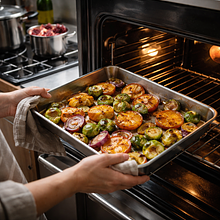 Wstaw blachę do nagrzanego piekarnika i piecz 30-40 minut, przewracając warzywa raz w połowie czasu (ok. po 15-20 minutach). Piecz do momentu, gdy warzywa będą miękkie przy nakłuciu widelcem i zaczną się lekko karmelizować na brzegach — marchew i pietruszka powinny mieć złoto-brązowe skórki, seler miękki w środku, a burak cienko karmelizowany.