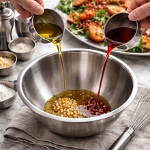 Do średniej miseczki wlej 30 g oliwy z oliwek (dodatkowe), 30 g octu winnego czerwonego, 15 g musztardy Dijon i 20 g soku z cytryny. Jeśli chcesz dressing słodszy, dodaj 20 g miodu (opcjonalnie). Ubij składniki trzepaczką lub widelcem energicznie przez 30-45 sekund, aż emulsja będzie jednolita, lekko gęsta i błyszcząca. Dopraw 1 szczyptą soli (1 g) i 1 szczyptą pieprzu (1 g), spróbuj i w razie potrzeby skoryguj — więcej octu dla kwasowości lub miodu dla słodyczy.