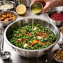 Umieść jarmuż (150 g) w dużej misce, skrop 10 g soku z cytryny (część z przygotowanych 20 g) i dodaj szczyptę soli (1 g). Masuj liście dłońmi przez 1-2 minuty: chwytaj liść u nasady i ugniataj, aż liście zmiękną i zmienią kolor na nieco ciemniejszy — to łagodzi gorzkawy smak i ułatwia trawienie.