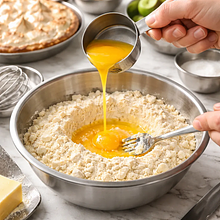 Zrób wgłębienie w środku mączno-maślanej mieszanki i wlej 60 g jajka (1 całe jajko). Szybko wymieszaj widelcem lub szpatułką tylko środkową część, a następnie dociśnij resztę składników ręką, aż masa zacznie się łączyć. Nie wyrabiaj zbyt długo — jeśli masa jest sucha, dodaj 1-2 łyżki zimnej wody (max 30 g). Gdy ciasto tylko zacznie się łączyć, uformuj płaski dysk, owiń folią i włóż do lodówki na minimum 45 minut (optymalnie 60 minut). Ciasto jest gotowe do schłodzenia, gdy można je rozwałkować bez nadmiernego przyklejania.