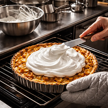 Wyjmij wstępnie upieczoną szarlotkę z piekarnika (powinna być złotobrązowa) i szybko rozprowadź przygotowaną pianę z białek równomiernie na gorącym cieście, tworząc dekoracyjne fale lub ostre szczyty łyżką. Jeśli używasz wiórków migdałowych (30 g opcjonalnie), posyp je teraz po wierzchu bezy delikatnie. Włóż ciasto ponownie do piekarnika i przypiekaj 3-6 minut pod funkcją grilla (broil) lub w temperaturze 200°C, aż wierzch bezy nabierze jasnobrązowych, delikatnie karmelizowanych szczytów. Uważaj — beza bardzo szybko się przypala, obserwuj przez szybkę piekarnika co 30 sekund.