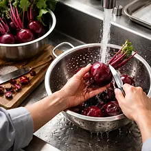 Rozgrzej piekarnik do 200°C (góra-dół). Umyj buraki pod bieżącą wodą, obetnij końcówki i ewentualne cienkie korzonki. Zawiń każdy burak osobno w folię aluminiową (zapobiegnie to nadmiernemu wysychaniu). Ułóż na blasze wyłożonej papierem do pieczenia i piecz przez 45–60 minut (czas zależy od wielkości buraków). Sprawdź widelcem: burak jest gotowy, gdy widelec wchodzi łatwo do środka, a miąższ jest miękki.