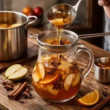 Wyłącz ogień i dodaj sok z połówki pomarańczy oraz 20 ml soku z cytryny. Przykryj garnek pokrywką i odstaw na 10 minut, aby smaki się „przegryzły” i napój nieco się schłodził (temp. do ok. 70°C) — to bezpieczna temperatura do serwowania na gorąco bez parzenia ust. Jeśli używasz anyżu gwiaździstego, dodaj go teraz dla delikatniejszej nuty.