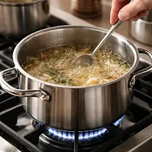 Postaw garnek na średnim ogniu. Doprowadź zawartość do delikatnego wrzenia — do momentu, gdy z garnka zaczną unosić się małe bąbelki i para, ale nie gwałtowne, bulgoczące wrzenie. Gdy zacznie wrzeć, zmniejsz ogień do małego i gotuj na bardzo wolnym ogniu przez 18-20 minut, aby owoce i przyprawy zdążyły się dobrze przegryźć. W trakcie gotowania zamieszaj 1-2 razy drewnianą łyżką.