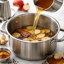 Po 10–15 minutach zdejmij garnek z ognia. Wyjmij laski cynamonu, goździki i anyż (jeśli były użyte). Dodaj miód i sok wyciśnięty z pomarańczy oraz sok z cytryny. Mieszaj drewnianą łyżką lub silikonową łopatką aż miód całkowicie się rozpuści — potrwa to 1–2 minuty. Spróbuj napoju i jeśli jest zbyt kwaśny dodaj odrobinę więcej miodu (po 5–10 g). Jeśli planujesz dodać alkohol (rum), zdejmij garnek całkowicie z gorącej płyty i dopiero wtedy wlej rum, mieszając delikatnie.