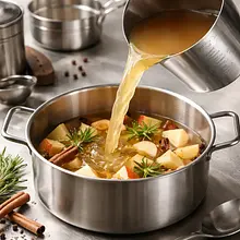 Gdy pomału pojawi się para i na powierzchni pojawią się małe bąbelki (temperatura około 70–80°C), zmniejsz ogień do małego i utrzymuj lekkie podgrzewanie przez 12–15 minut. W tym czasie owoce powinny oddać sok, a przyprawy uwolnić aromat. Po 12–15 minutach sprawdź zapach i smak: napój powinien pachnieć intensywnie korzennie, a smak wyważony między słodyczą a kwaskowatością.