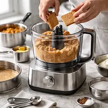 Przygotuj spód: umieść 200 g herbatników w blenderze/robotie kuchennym i zmiksuj na drobną kruszonkę (powinna być jednolita, bez dużych kawałków). Jeśli nie masz blendera, włóż herbatniki do plastikowego worka i zmiażdż wałkiem do ciasta, aż utworzą się drobne okruchy.