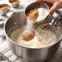 Do kremowego sera dodaj 150 g cukru białego i 50 g brązowego cukru. Miksuj na niskich obrotach, aż cukier zostanie włączony — około 1–2 minuty. Następnie dodaj 180 g jajek po jednym, miksując krótko po każdym (tylko do połączenia).