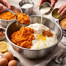 Do miski dodaj 400 g puree z dyni, 200 ml śmietany kremówki, 30 ml soku z cytryny, 2 g cynamonu i 2 g imbiru. Jeśli używasz, dodaj 10 ml ekstraktu waniliowego. Delikatnie wymieszaj szpatułką lub mikserem na najniższych obrotach do uzyskania jednolitego, gładkiego koloru i konsystencji — masa powinna być jednorodna, bez widocznych pasm sera.