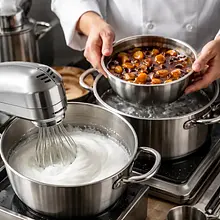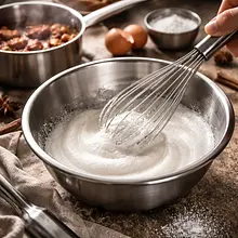 Przygotuj piankę: w metalowej lub żaroodpornej misce umieść białka z 2 jaj oraz 30 g cukru pudru. Ustaw miskę nad garnkiem z delikatnie gotującą się wodą (bain-marie) — woda nie powinna dotykać dna miski. Mieszaj równomiernie trzepaczką przez około 3-4 minuty, aż mieszanka będzie ciepła i cukier się rozpuści (możesz sprawdzić między palcami — nie powinno być kryształków cukru).