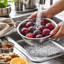 Nagrzej piekarnik do 200°C (jeśli masz termoobieg ustaw 190°C). Umyj śliwki pod bieżącą wodą i osusz ręcznikiem papierowym. Przekrój każdą śliwkę na pół wzdłuż i usuń pestki: przepołowioną owoc przytrzymaj w jednej dłoni, ostrożnie wsuń ostrze noża przy pestce i obróć owoc. Ułóż połówki skórką do dołu na blasze wyłożonej papierem do pieczenia lub na lekko natłuszczonej blasze.