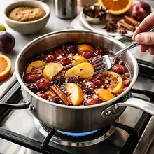 Po doprawieniu odstaw garnek na 5 minut, aby napój lekko przestudził i aromaty się 'przegryzły'. Jeśli chcesz klarowniejszego napoju, przelej kompot przez gęste sitko do czajnika lub garnka, zostawiając owoce i przyprawy; jeśli wolisz serwować z owocami, pozostaw je w płynie.
