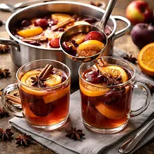 Tradycyjny, sezonowy kompot korzenny to aromatyczny, rozgrzewający napój bezalkoholowy, popularny w kuchni polskiej zwłaszcza w okresie jesienno-zimowym. Bazuje na świeżych jabłkach, suszonych śliwkach i plastrach pomarańczy, z dodatkiem korzennych przypraw (cynamon, anyż, goździki) oraz cytryny dla świeżości. Ma intensywny, głęboki kolor pochodzący od śliwek i plasterków pomarańczy, smak słodko-kwaśny z wyraźną nutą korzenną i cytrusową. Podawany na gorąco jako rozgrzewający napój podczas świątecznych spotkań, kolędowania lub jako dodatek do ciast i deserów; świetnie komponuje się z piernikami, makowcami i sernikami. Napój jest atrakcyjny wizualnie dzięki pływającym plastry pomarańczy i cynamonowym pałeczkom, a intensywny aromat korzennych przypraw przyciąga uwagę i zaprasza do degustacji.