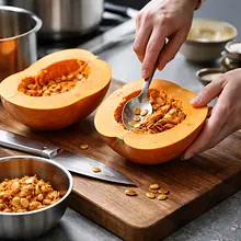 Nagrzej piekarnik do 200°C (góra-dół). Przekrój dynię na pół, usuń włóknisty środek i pestki łyżką. Pokrój miąższ w większe kawałki (ok. 3–4 cm). Ułóż kawałki na blaszce wyłożonej papierem do pieczenia skórą do góry, posmaruj odrobiną masła (ok. 10 g) i lekko posól. Piecz 30–35 minut, aż miąższ będzie miękki — sprawdź widelcem: powinien łatwo wchodzić i miąższ powinien być kremowy.
