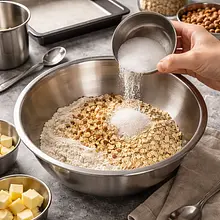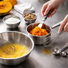 Rozgrzej piekarnik do 200°C (góra‑dół). Przekrój dynię na pół, usuń nasiona i błony łyżką, a miąższ pokrój na większe kawałki. Ułóż kawałki na blasze wyłożonej papierem do pieczenia skórą do dołu. Piecz 35–40 minut aż miąższ będzie bardzo miękki i zacznie lekko karmelizować przy brzegach — wbijając widelec powinna wchodzić gładko. Po wystudzeniu wydrąż miąższ i zważ (powinno zostać około 400 g).