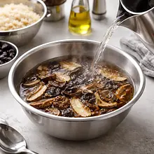 Namocz suszone grzyby: umieść suszone grzyby w misce i zalej 300 ml ciepłej wody (ok. 50°C). Odstaw na 30–45 minut, aż zmiękną. Po namoczeniu odcedź grzyby przez sitko, zachowaj wodę z namaczania (osad odcedź przez gazę lub drobne sito i dodaj do bulionu). Pokrój namoczone grzyby na średnie kawałki.