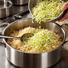 Dodaj teraz do garnka kiszoną kapustę (800 g) i poszatkowaną świeżą kapustę (400 g). Wymieszaj wszystkie składniki tak, aby kapusty dobrze połączyły się z podsmażonymi warzywami i grzybami. Wlej bulion warzywny (500 ml) oraz zachowaną wodę z namaczania grzybów (jeśli była czysta, ok. 100–150 ml). Dodaj liście laurowe (3 szt.), kule ziela angielskiego (3 szt.), lekko zmiażdżone jagody jałowca (6 szt.), cukier (10 g) oraz w razie potrzeby sól i pieprz (na razie delikatnie).