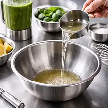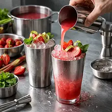 Przygotuj syrop rabarbarowo-bazyliowy. Pokrój rabarbar na kawałki o długości ok. 2 cm (nie musisz obierać, ale usuń włókniste końcówki). Umieść 300 g pokrojonego rabarbaru, 150 g cukru i 500 ml wody w szerokim rondlu. Dodaj 6 g (ok. garść) liści bazylii (zachowaj kilka listków do dekoracji). Podgrzewaj na średnim ogniu aż syrop zacznie delikatnie wrzeć, mieszaj drewnianą łyżką, aby cukier się rozpuścił. Zmniejsz ogień i gotuj na małym ogniu 8-10 minut, aż rabarbar rozpadnie się i puści sok — masa powinna być miękka i intensywnie różowa. Wyłącz ogień i odstaw do lekkiego przestudzenia (5 minut).