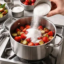 Zredukuj ogień do małego i gotuj syrop 10–12 minut, mieszając od czasu do czasu. Syrop jest gotowy, gdy kawałki owoców się rozpadną, a płyn zgęstnieje do konsystencji rzadkiego dżemu - gdy łyżka pozostawia widoczny ślad. Usuń z ognia i odstaw do przestudzenia przez 10 minut.