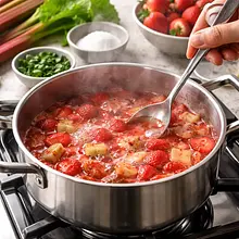 Umyj rabarbar: odetnij twarde końce i pokrój łodygi na kawałki o długości około 2 cm. Umyj truskawki, usuń szypułki i przekrój większe sztuki na ćwiartki. W średnim garnku o pojemności około 1,5–2 litrów włóż pokrojony rabarbar (300 g), truskawki (400 g), cukier (100 g) i 250 ml wody. Zamieszaj drewnianą łyżką, aby cukier równomiernie rozprowadził się między owocami.