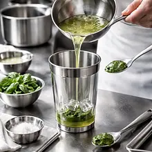 Umyj i osusz liście bazylii (20 g). Włóż liście do małego blendera lub wysokiego pojemnika do miksowania, dodaj około 30 ml schłodzonego syropu (z poprzedniego etapu) i miksuj do utworzenia gładkiej, jasnozielonej pasty — powinno to zająć 20–30 sekund. Przelej pastę bazyliową do miski i odstaw.