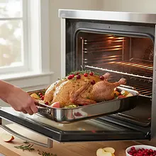 Wstaw brytfannę z kaczką do nagrzanego piekarnika i piecz przez 30 minut w wysokiej temperaturze (200°C z termoobiegiem). Po tym czasie zmniejsz temperaturę do 130°C (termoobieg) i piecz przez kolejne 3-4 godziny. Co około 45 minut polewaj kaczkę tłuszczem, który się z niej wytopił. To klucz do soczystego mięsa i chrupiącej skórki.