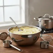 W czasie, gdy kaczka się piecze, przygotuj kluski. Ziemniaki obierz, umyj i ugotuj w osolonej wodzie do absolutnej miękkości - powinny się rozpadać po dotknięciu widelcem. Odcedź je bardzo dokładnie i od razu, jeszcze gorące, przeciśnij przez praskę do ziemniaków lub dokładnie utłucz tłuczkiem. Masa musi być idealnie gładka, bez żadnych grudek.