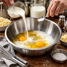 W dużej misce wbij jajka (120 g = 2 szt.). Dodaj śmietanę kremówkę (200 ml) i mleko (100 ml). Dodaj sól (5 g), pieprz (2 g) i świeżo startą gałkę muszkatołową (1 g). Używając trzepaczki ręcznej, energicznie wymieszaj masę przez około 30-45 sekund, aż będzie jednorodna i lekko pienista. Masa powinna być płynna, dobrze połączona; nie ma grudek jajka.