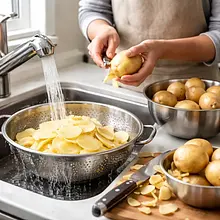 Obierz ziemniaki i opłucz je pod zimną wodą. Używając mandoliny lub ostrego noża krojones ziemniaki w bardzo cienkie plasterki o grubości 2–3 mm. Rób to na desce, trzymaj ziemniaka stabilnie jedną ręką, a drugim prowadź plastry równomiernie. Po pokrojeniu trzymaj plasterki w zimnej wodzie, aby pozbyć się nadmiaru skrobi.