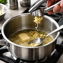Obierz i drobno posiekaj lub przeciśnij przez praskę czosnek. W średnim rondlu rozpuść 20 g masła na małym ogniu (ok. 1–2 minuty), aż przestanie się pienić — nie pozwól mu się zrumienić. Dodaj czosnek i smaż mieszając 20–30 sekund, aż zacznie pachnieć (nie rumienić). Wlej śmietankę i mleko, podgrzewaj na średnim ogniu, mieszając, aż zacznie się delikatnie gotować (małe pęcherzyki przy brzegach) — ok. 3–4 minuty. Zdejmij z ognia i dopraw solą (ok. 2 szczypty z przewidzianych 3), świeżo mielonym pieprzem oraz opcjonalnie odrobiną świeżo startej gałki muszkatołowej (1 szczypta). Sos powinien lekko zgęstnieć i mieć aksamitną konsystencję.