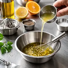 Przygotuj dressing: w małej misce lub słoiku połącz 15 ml oliwy z oliwek, pozostałe 20 ml soku z cytryny, 20 g musztardy Dijon i 20 g miodu. Dodaj 1 g soli i 0.5 g pieprzu. Energicznie wymieszaj trzepaczką lub zakręć słoikiem przez 20–30 sekund, aż dressing stanie się jednolity i lekko emulsyjny.