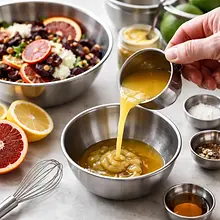 Do małej miseczki wlej sok z pomarańczy, sok z cytryny (20 ml), dodaj musztardę Dijon (15 g), 15 g miodu (jeśli chcesz słodszy dressing — użyj więcej soku z pomarańczy z filetowania), 50 g oliwy z oliwek i szczyptę soli (2 g) oraz pieprz (1 g). Ubij wszystko energicznie widelcem lub trzepaczką przez około 30–45 sekund, aż uzyskasz emulsję (dressing powinien być gładki i lekko gęstnieć). Spróbuj i w razie potrzeby dopraw dodatkowym sokiem z cytryny lub solą.
