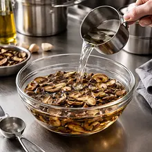 Użyj ceramicznej lub szklanej miski. Jeśli po 40 minutach środek grzybów jest nadal twardy, przedłuż namaczanie do 60 minut. Wywar z grzybów zachowaj — dodamy go do bulionu dla wzmocnienia smaku.
