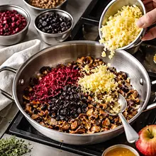 Do patelni z grzybami dodaj starty burak (z kroku 3), pokrojone suszone śliwki (80 g) oraz starte jabłko (200 g). Smaż 3-4 minuty, aż jabłko zacznie mięknąć. Przełóż zawartość patelni do dużej miski. Dodaj ugotowaną kaszę gryczaną, 15 g mielonego siemienia lnianego wymieszanego z 45 g ciepłej wody (odstawić 5 minut, aż zgęstnieje), 2 łyżeczki (4 g) tymianku suszonego oraz 30 g posiekanej natki pietruszki. Dokładnie wymieszaj farsz - powinien być wilgotny, spoisty, ale nie wodnisty.