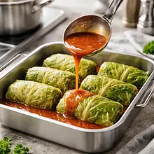 Polej gołąbki w naczyniu przygotowanym sosem tak, aby sos sięgał do 1/3 wysokości gołąbków. Przykryj naczynie pokrywką lub szczelnie folią aluminiową i wstaw do piekarnika rozgrzanego do 180°C. Piecz 30 minut pod przykryciem, następnie zdejmij pokrywę i piecz jeszcze 10-15 minut, aby wierzch lekko się skarmelizował.