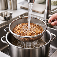 Użyj garnka z ciężkim dnem o pojemności min. 2 litrów i przykrywki. Kasza jest gotowa, gdy woda jest wchłonięta i ziarna są jędrne, nie rozgotowane. Jeśli po 15 minutach zostanie trochę wody, odcedź resztę i odstaw.