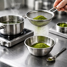 Przesiej 2 g matchy przez drobne sitko do małej miseczki (zapobiegnie grudkom). Podgrzej 30 ml wody do temperatury około 60°C (powinna być gorąca, ale nie wrząca). Wlej 30 ml wody do matchy i energicznie ubijaj chasenem lub małą trzepaczką ruchem 'M' przez około 20-30 sekund, aż powstanie jednolita, intensywnie zielona, lekko pienista pasta.