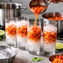 Do czterech wysokich szklanek nałóż po 50 g kruszonego lodu. Rozlej przygotowaną mieszankę owocowo-syropową po równo (około 125-140 ml na szklankę). Na każdą porcję delikatnie nałóż łyżką 1/2 porcji ubitej pasty matcha (ok. 7-8 ml na szklankę) — matcha powinna unosić się częściowo na powierzchni, tworząc zieloną piankę. Dopełnij każdą szklankę schłodzoną wodą gazowaną (około 100 ml) — wlej powoli po łyżce przy ściance, aby zachować efekt warstw. Jeśli robisz wersję alkoholową, dodaj 12-15 ml ciemnego rumu do każdej szklanki przed dolaniem wody gazowanej i delikatnie zamieszaj.