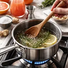 Postaw rondelek na średnim ogniu i doprowadź do delikatnego wrzenia. Mieszaj drewnianą łyżką, aż cukier się całkowicie rozpuści (ok. 2-3 minut). Zmniejsz ogień do małego i gotuj syrop przez 8-10 minut na wolnym ogniu — tak, aby płyn lekko zgęstniał i nabrał aromatu imbiru i rozmarynu.