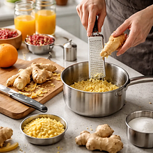 Przygotuj syrop imbirowy: obierz imbir i drobno go posiekaj lub zetrzyj na tarce o drobnych oczkach. W małym rondelku połącz 100 g cukru, 100 ml wody i starty imbir (20 g). Postaw na średnim ogniu i podgrzewaj, mieszając drewnianą łyżką, aż cukier całkowicie się rozpuści (ok. 2–3 minuty). Zmniejsz ogień i gotuj delikatnie 2–3 minuty, aż syrop stanie się lekko gęsty i zacznie lekko parować. Zestaw z ognia i odstaw na 5 minut, by aromaty się przegryzły. Przelej przez drobne sito bezpośrednio do dzbanka, lekko dociskając imbir łyżką, aby wydobyć aromat; wyrzuć resztki imbiru.