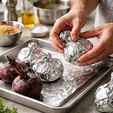 Zawiń każdy burak osobno w folię aluminiową (tak, aby para wewnątrz przyspieszyła mięknięcie). Połóż połówki jabłek na blasze skórką do góry (możesz posypać je lekko cynamonem, jeśli lubisz). Wstaw do nagrzanego piekarnika. Piecz buraki 45–60 minut (w zależności od wielkości) — sprawdź widelcem: powinien wchodzić bez oporu. Jabłka piecz 25–30 minut, aż skórka lekko się pomarszczy, a miąższ zmięknie.