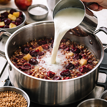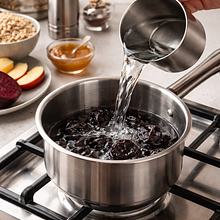 W małym garnku wlej 200 ml wody, dodaj suszone śliwki i doprowadź do wrzenia. Zmniejsz ogień i gotuj 10–12 minut, aż śliwki napęcznieją, a płyn lekko zgęstnieje. W osobnym rondelku wsyp 30 g pęczaku, zalej 120 ml wody (proporcja ok. 1:4 dla półmiękkiej tekstury), zagotuj, przykryj i gotuj na małym ogniu 20–25 minut aż będzie al dente — powinien być miękki na zewnątrz, z lekką sprężystością wewnątrz.